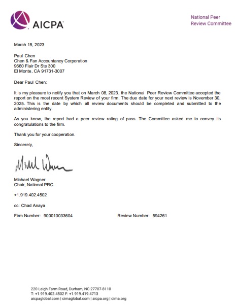 The latest Peer Review on the firm resulted in a pass without deficiencies opinion which signifies that Chen & Fan complies with the highest standards of quality service